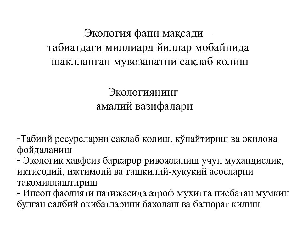 Экология фани мақсади – табиатдаги миллиард йиллар мобайнида шаклланган мувозанатни сақлаб қолиш Табиий ресурсларни сақлаб қолиш, кўпайтириш ва оқилона фойдаланиш Экологик хавфсиз баркарор ривожланиш учун мухандислик, иктисодий, ижтимоий ва ташкилий-хукукий асосларни такомиллаштириш Инсон фаолияти натижасида атроф мухитга нисбатан мумкин булган салбий окибатларини бахолаш ва башорат килиш Экологиянинг амалий вазифалари