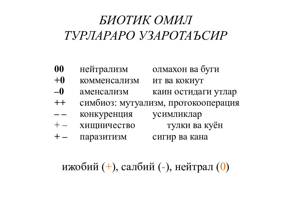 ижобий ( + ), салбий ( - ), нейтрал ( 0 ) 00 нейтрализм олмахон ва буги +0 комменсализм ит ва кокиут –0 аменсализм каин остидаги утлар ++ симбиоз: мутуализм, протокооперация – – конкуренция усимликлар + – хищничество тулки ва куён + – паразитизм сигир ва кана