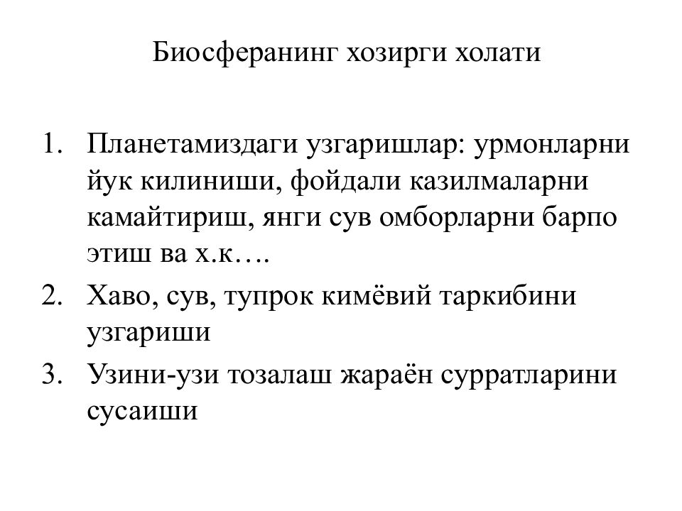 Планетамиздаги узгаришлар: урмонларни йук килиниши, фойдали казилмаларни камайтириш, янги сув омборларни барпо этиш ва х.к …. Хаво, сув, тупрок кимёвий таркибини узгариши Узини-узи тозалаш жараён сурратларини сусаиши