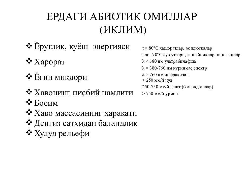 Ёруглик, куёш энергияси Харорат Ёгин микдори Хавонинг нисбий намлиги Босим Хаво массасининг харакати Денгиз сатхидан баландлик Худуд рельефи t > 80°C хашоратлар, моллюскалар t до -7 0°C сув утлари, лишайниклар, пингвинлар λ < 380 нм ультрабинафша λ = 380-760 нм куринмас спектр λ > 760 нм инфракизил < 250 мм/й чул 250-750 мм/й дашт (бошокдошлар) > 750 мм/й урмон