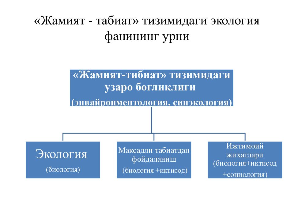 - Бу табиатни ривожланиши т ўғ рисидаги қ онунларни, тирик организларнинг му ҳ ит билан яхлитлиги ёки ў заро бо ғ ликлигини, табиат қ онуниятларининг инсонларга таъсир реакциясини, шу билан бир қ аторда жамият томонидан табиий тизимга рухсат этилган босимни ў рганади. Экологиянинг ў рганиш объекти – экотизимлар (биосферани таркибий бирликлари).
