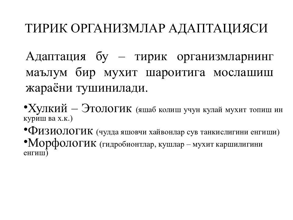 Хулкий – Этологик (яшаб колиш учун кулай мухит топиш ин куриш ва х.к.) Физиологик (чулда яшовчи хайвонлар сув танкислигини енгиши) Морфологик (гидробионтлар, кушлар – мухит каршилигини енгиш) Адаптация бу – тирик организмларнинг маълум бир мухит шароитига мослашиш жараёни тушинилади.