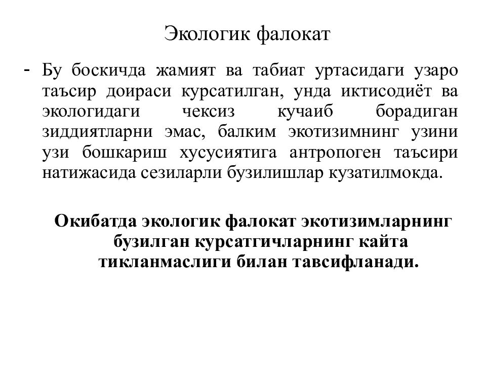 Последний слайд презентации: Mavzu: Kirish. Ekologiya fani, uning maqsad va vazifalari. Reja: 1. E kologiya