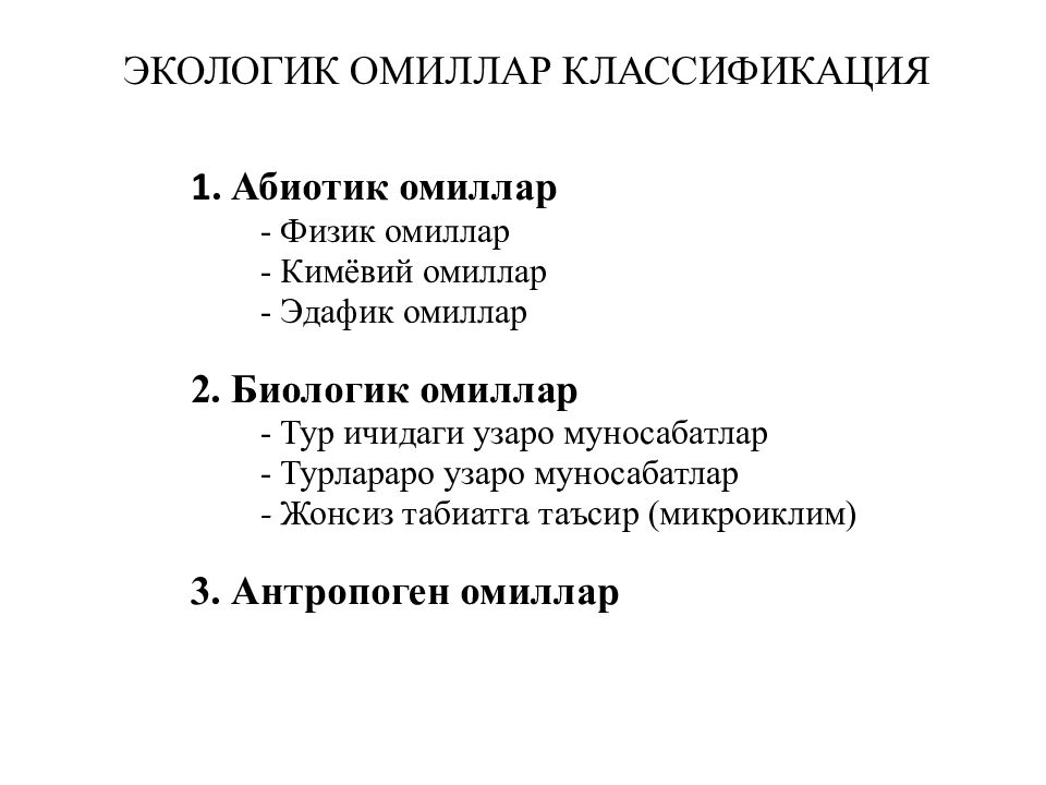 1. Абиотик омиллар - Физик омиллар - Кимёвий омиллар - Эдафик омиллар 2. Биологик омиллар - Тур ичидаги узаро муносабатлар - Турлараро узаро муносабатлар - Жонсиз табиатга таъсир (микроиклим) 3. Антропоген омиллар