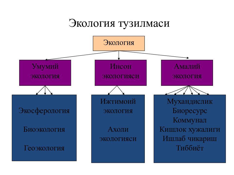 Экология Умумий экология Инсон экологияси Амалий экология Ижтимоий экология Ахоли экологияси Экосферология Биоэкология Геоэкология Мухандислик Биоресурс Коммунал Кишлок хужалиги Ишлаб чикариш Тиббиёт