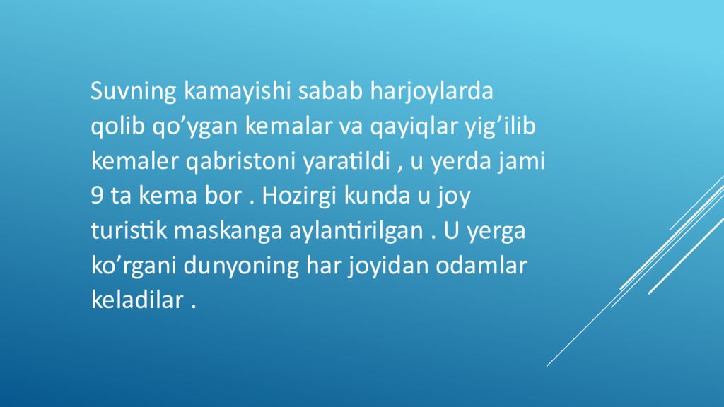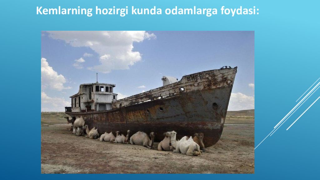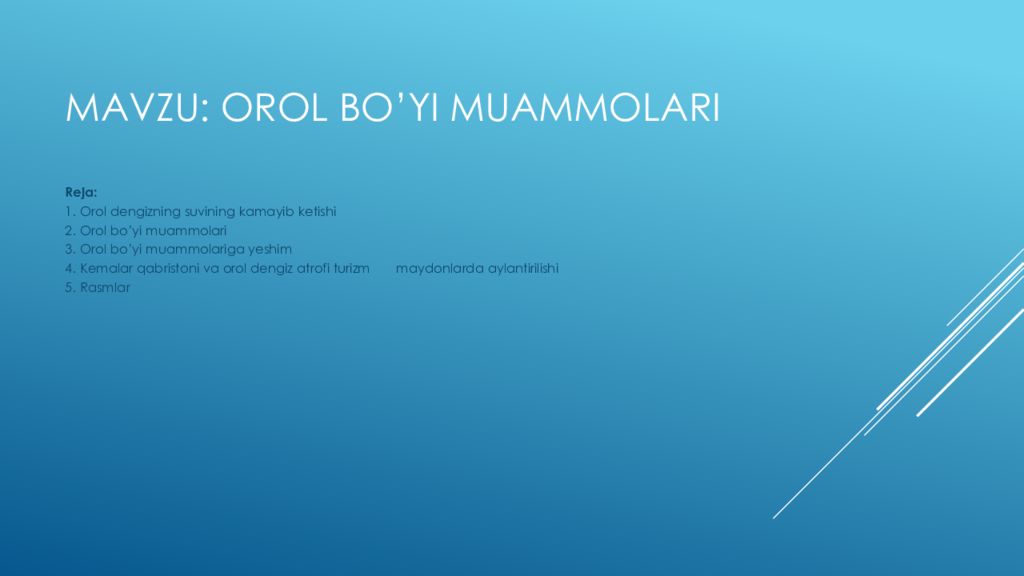 Reja : 1. Orol dengizning suvining kamayib ketishi 2. Orol bo’yi muammolari 3. Orol bo’yi muammolariga yeshim 4. Kemalar qabristoni va orol dengiz atrofi turizm maydonlarda aylantirilishi 5. Rasmlar