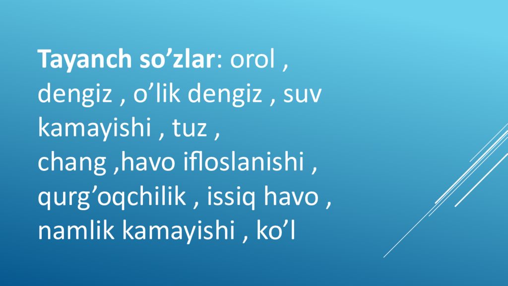 Tayanch so’zlar : orol, dengiz, o’lik dengiz, suv kamayishi, tuz, chang, havo ifloslanishi, qurg’oqchilik, issiq havo, namlik kamayishi, ko’l
