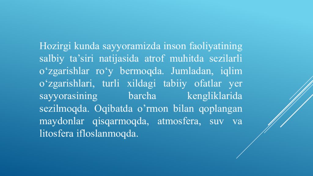 Hozirgi kunda sayyoramizda inson faoliyatining salbiy ta’siri natijasida atrof muhitda sezilarli o‘zgarishlar ro‘y bermoqda. Jumladan, iqlim o‘zgarishlari, turli xildagi tabiiy ofatlar yer sayyorasining barcha kengliklarida sezilmoqda. Oqibatda o’rmon bilan qoplangan maydonlar qisqarmoqda, atmosfera, suv va litosfera ifloslanmoqda.