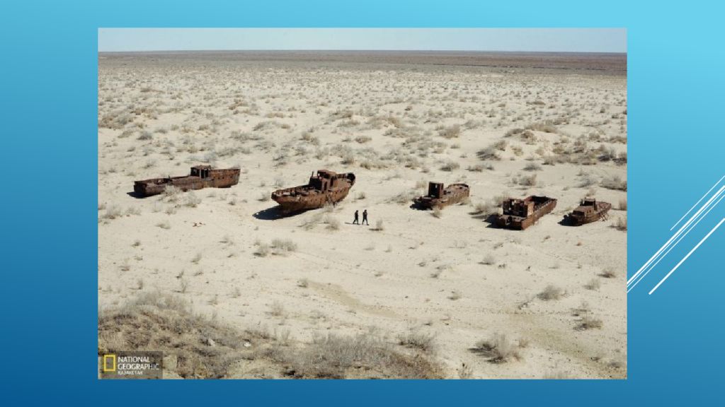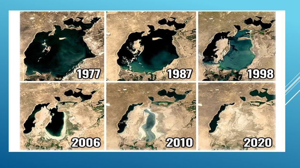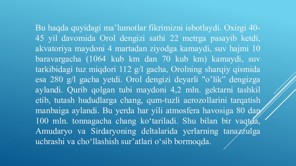 Bu haqda quyidagi ma’lumotlar fikrimizni isbotlaydi. Oxirgi 40-45 yil davomida Orol dengizi sathi 22 metrga pasayib ketdi, akvatoriya maydoni 4 martadan ziyodga kamaydi, suv hajmi 10 baravargacha (1064 kub km dan 70 kub km ) kamaydi, suv tarkibidagi tuz miqdori 112 g/l gacha, Orolning sharqiy qismida esa 280 g/l gacha yetdi. Orol dengizi deyarli " o’lik ” dengizga aylandi. Qurib qolgan tubi maydoni 4,2 mln. gektarni tashkil etib, tutash hududlarga chang, qum-tuzli aerozollarini tarqatish manbaiga aylandi. Bu yerda har yili atmosfera havosiga 80 dan 100 mln. tonnagacha chang ko‘tariladi. Shu bilan bir vaqtda, Amudaryo va Sirdaryoning deltalarida yerlarning tanazzulga uchrashi va cho‘llashish sur’atlari o‘sib bormoqda.