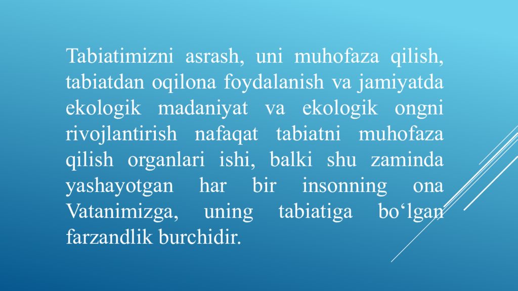 Tabiatimizni asrash, uni muhofaza qilish, tabiatdan oqilona foydalanish va jamiyatda ekologik madaniyat va ekologik ongni rivojlantirish nafaqat tabiatni muhofaza qilish organlari ishi, balki shu zaminda yashayotgan har bir insonning ona Vatanimizga, uning tabiatiga bo‘lgan farzandlik burchidir.
