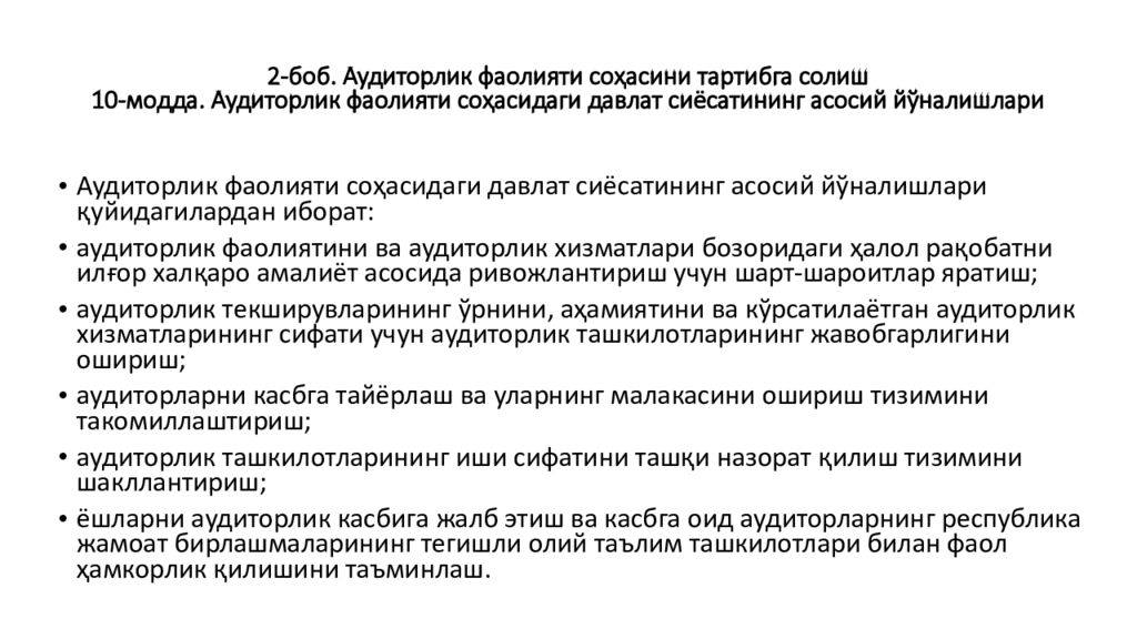 Слайд 7: 2-боб. Аудиторлик фаолияти соҳасини тартибга солиш 10-модда. Аудиторлик фаолияти соҳасидаги давлат сиёсатининг асосий йўналишлари