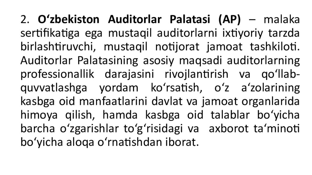 2. O‘zbekiston Auditorlar Palatasi (AP) – malaka sertifikatiga ega mustaqil auditorlarni ixtiyoriy tarzda birlashtiruvchi, mustaqil notijorat jamoat tashkiloti. Auditorlar Palatasining asosiy maqsadi auditorlarning professionallik darajasini rivojlantirish va qo‘llab-quvvatlashga yordam ko‘rsatish, o‘z a‘zolarining kasbga oid manfaatlarini davlat va jamoat organlarida himoya qilish, hamda kasbga oid talablar bo‘yicha barcha o‘zgarishlar to‘g‘risidagi va axborot ta‘minoti bo‘yicha aloqa o‘rnatishdan iborat.