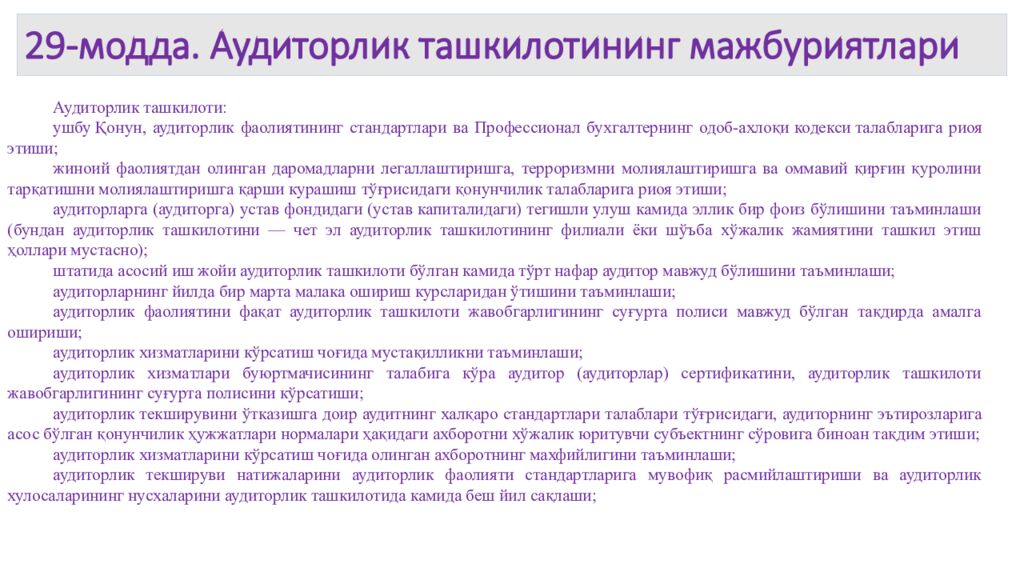 Слайд 14: 29-модда. Аудиторлик ташкилотининг мажбуриятлари