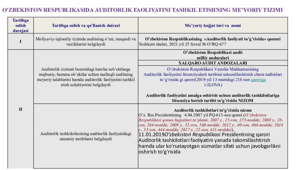 Tartibga solish darajasi Tartibga solish va qo’llanish doirasi Me’yoriy hu j ja t turi va nomi I Moliyaviy-iqtisodiy tizimda auditning o’rni, maqsadi va vazifalarini belgilaydi O’zbekiston Respublikasining «Auditorlik faoliyati to’g’risida» qonuni Toshkent shahri, 2021 yil 25 fevral № О‘RQ-677 II Auditorlik xizmati bozoridagi barcha sub’ektlarga majburiy, hamma ob’ektlar uchun taalluqli auditning meyoriy talablarini hamda auditorlik faoliyatini tashkil etish uslubiyotini belgilaydi O’zbekiston Respublikasi audit milliy andozalari XALQARO AUDIT ANDOZALARI O‘ zbekiston R espublikasi V azirlar M ahkamasining A uditorlik faoliyatini litsenziyalash tartibini takomillashtirish chora-tadbirlari to‘g‘risida gi qarori(2019-yil 13-martdagi 218-son qaroriga 1-ILOVA) Auditorlik faoliyatini amalga oshirish uchun auditorlik tashkilotlariga litsenziya berish tartibi to’g’risida NIZOM Auditorlik tashkilotlarining auditorlik faoliyatidagi umumiy tartiblarni belgilaydi Auditorlik tashkilotlari to’g’risida nizom O’z. Res.Prezidentining 4.04.2007 yil PQ-615-son qarori ( O‘zbekiston Respublikasi qonun hujjatlari to‘plami, 2007 y., 15-son, 155-modda; 2008 y., 28-son, 264-modda; 2009 y., 52-son, 560-modda; 2012 y., 40-son, 466-modda; 2014 y., 35-son, 444-modda; 2017 y., 22-son, 411-modda) ), 11.01.2019 O‘zbekiston Respublikasi P rezidentining qarori A uditorlik tashkilotlari faoliyatini yanada takomillashtirish hamda ular ko‘rsatayotgan xizmatlar sifati uchun javobgarlikni oshirish to‘g‘risida