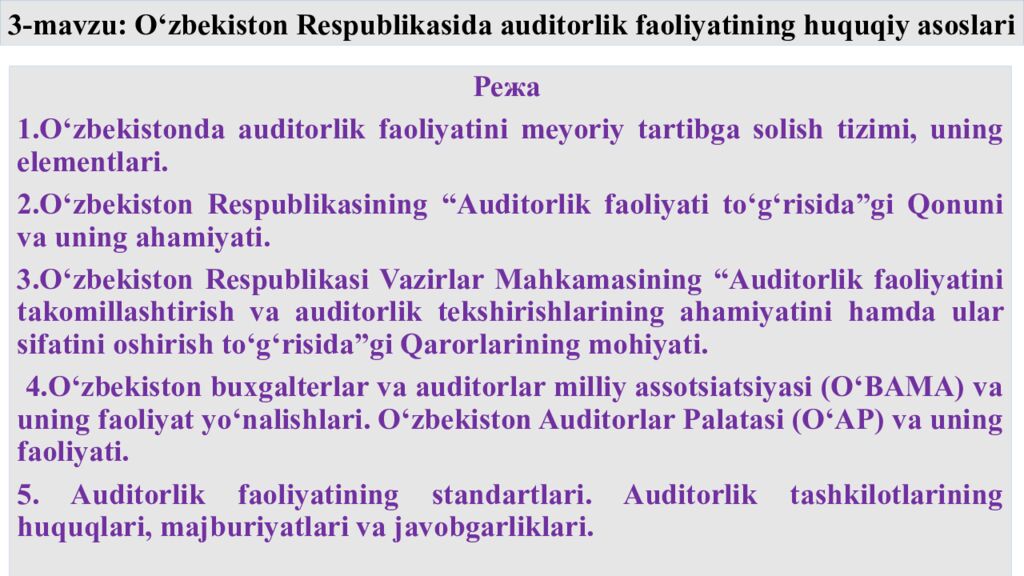 Режа 1.O‘zbekistonda auditorlik faoliyatini meyoriy tartibga solish tizimi, uning elementlari. 2. O‘zbekiston Respublikasining “ Auditorlik faoliyati to‘g‘risida ” gi Qonuni va uning ahamiyati. 3. O‘zbekiston Respublikasi Vazirlar Mahkamasining “ Auditorlik faoliyatini takomillashtirish va auditorlik tekshirishlarining ahamiyatini h amda ular sifatini oshirish to‘g‘risida ” gi Qarorlarining mohiyati. 4. O‘zbekiston buxgalterlar va auditorlar milliy assotsiatsiyasi (O‘BAMA) va uning faoliyat yo‘nalishlari. O‘zbekiston Auditorlar Palatasi (O‘AP) va uning faoliyati. 5. Auditorlik faoliyatining standartlari. Auditorlik tashkilotlarining huquqlari, majburiyatlari va javobgarliklari.