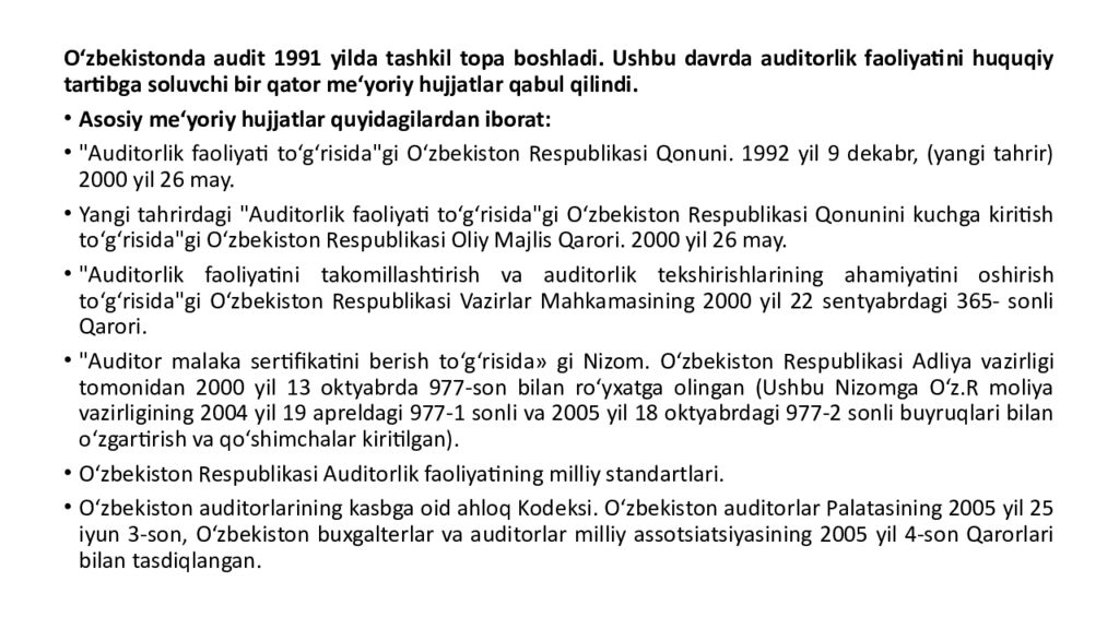 O‘zbekistonda audit 1991 yilda tashkil topa boshladi. Ushbu davrda auditorlik faoliyatini huquqiy tartibga soluvchi bir qator me‘yoriy hujjatlar qabul qilindi. Asosiy me‘yoriy hujjatlar quyidagilardan iborat: "Auditorlik faoliyati to‘g‘risida"gi O‘zbekiston Respublikasi Qonuni. 1992 yil 9 dekabr, (yangi tahrir) 2000 yil 26 may. Yangi tahrirdagi "Auditorlik faoliyati to‘g‘risida"gi O‘zbekiston Respublikasi Qonunini kuchga kiritish to‘g‘risida"gi O‘zbekiston Respublikasi Oliy Majlis Qarori. 2000 yil 26 may. "Auditorlik faoliyatini takomillashtirish va auditorlik tekshirishlarining ahamiyatini oshirish to‘g‘risida"gi O‘zbekiston Respublikasi Vazirlar Mahkamasining 2000 yil 22 sentyabrdagi 365- sonli Qarori. "Auditor malaka sertifikatini berish to‘g‘risida» gi Nizom. O‘zbekiston Respublikasi Adliya vazirligi tomonidan 2000 yil 13 oktyabrda 977-son bilan ro‘yxatga olingan (Ushbu Nizomga O‘z.R moliya vazirligining 2004 yil 19 apreldagi 977-1 sonli va 2005 yil 18 oktyabrdagi 977-2 sonli buyruqlari bilan o‘zgartirish va qo‘shimchalar kiritilgan). O‘zbekiston Respublikasi Auditorlik faoliyatining milliy standartlari. O‘zbekiston auditorlarining kasbga oid ahloq Kodeksi. O‘zbekiston auditorlar Palatasining 2005 yil 25 iyun 3-son, O‘zbekiston buxgalterlar va auditorlar milliy assotsiatsiyasining 2005 yil 4-son Qarorlari bilan tasdiqlangan.