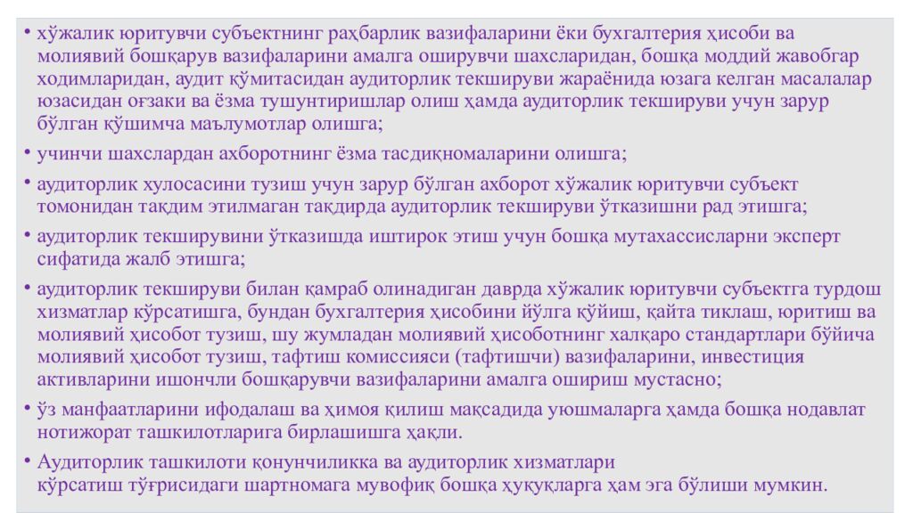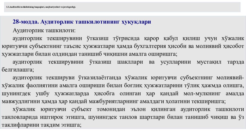 28-модда. Аудиторлик ташкилотининг ҳуқуқлари Аудиторлик ташкилоти : аудиторлик текширувини ўтказиш тўғрисида қарор қабул қилиш учун хўжалик юритувчи субъектнинг таъсис ҳужжатлари ҳамда бухгалтерия ҳисоби ва молиявий ҳисобот ҳужжатлари билан олдиндан танишиб чиқишни амалга оширишга ; аудиторлик текширувини ўтказиш шакллари ва усулларини мустақил тарзда белгилашга ; аудиторлик текшируви ўтказилаётганда хўжалик юритувчи субъектнинг молиявий-хўжалик фаолиятини амалга ошириши билан боғлиқ ҳужжатларини тўлиқ ҳажмда олишга, шунингдек ушбу ҳужжатларда ҳисобга олинган ҳар қандай мол- мулкнинг амалда мавжудлигини ҳамда ҳар қандай мажбуриятларнинг амалдаги ҳолатини текширишга ; хўжалик юритувчи субъект томонидан эълон қилинган аудиторлик ташкилоти танловларида иштирок этишга, шунингдек танлов шартлари билан танишиб чиқиш ва ўз таклифларини тақдим этишга ;
