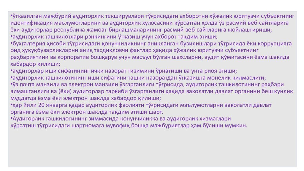 ўтказилган мажбурий аудиторлик текширувлари тўғрисидаги ахборотни хўжалик юритувчи субъектнинг идентификация маълумотларини ва аудиторлик хулосасини кўрсатган ҳолда ўз расмий веб- сайтларига ёки аудиторлар республика жамоат бирлашмаларининг расмий веб- сайтларига жойлаштириши ; аудиторлик ташкилотлари рэнкингини ўтказиш учун ахборот тақдим этиши ; бухгалтерия ҳисоби тўғрисидаги қонунчиликнинг аниқланган бузилишлари тўғрисида ёки коррупцияга оид ҳуқуқбузарликларни аниқ тасдиқловчи фактлар ҳақида хўжалик юритувчи субъектнинг раҳбариятини ва корпоратив бошқарув учун масъул бўлган шахсларни, аудит қўмитасини ёзма шаклда хабардор қилиши ; аудиторлар иши сифатининг ички назорат тизимини ўрнатиши ва унга риоя этиши ; аудиторлик ташкилотининг иши сифатини ташқи назоратдан ўтказишга монелик қилмаслиги ; ўз почта манзили ва электрон манзили ўзгарганлиги тўғрисида, аудиторлик ташкилотининг раҳбари алмашганлиги ва ( ёки ) аудиторлар таркиби ўзгарганлиги ҳақида ваколатли давлат органини беш кунлик муддатда ёзма ёки электрон шаклда хабардор қилиши ; ҳар йили 20 январга қадар аудиторлик фаолияти тўғрисидаги маълумотларни ваколатли давлат органига ёзма ёки электрон шаклда тақдим этиши шарт. Аудиторлик ташкилотининг зиммасида қонунчиликка ва аудиторлик хизматлари кўрсатиш тўғрисидаги шартномага мувофиқ бошқа мажбуриятлар ҳам бўлиши мумкин.