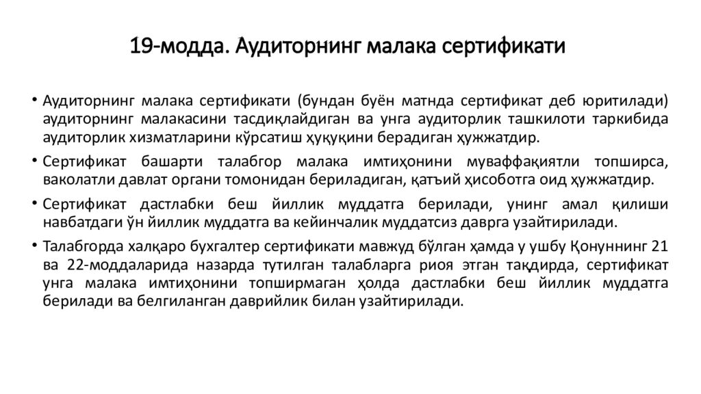 Слайд 9: 19-модда. Аудиторнинг малака сертификати