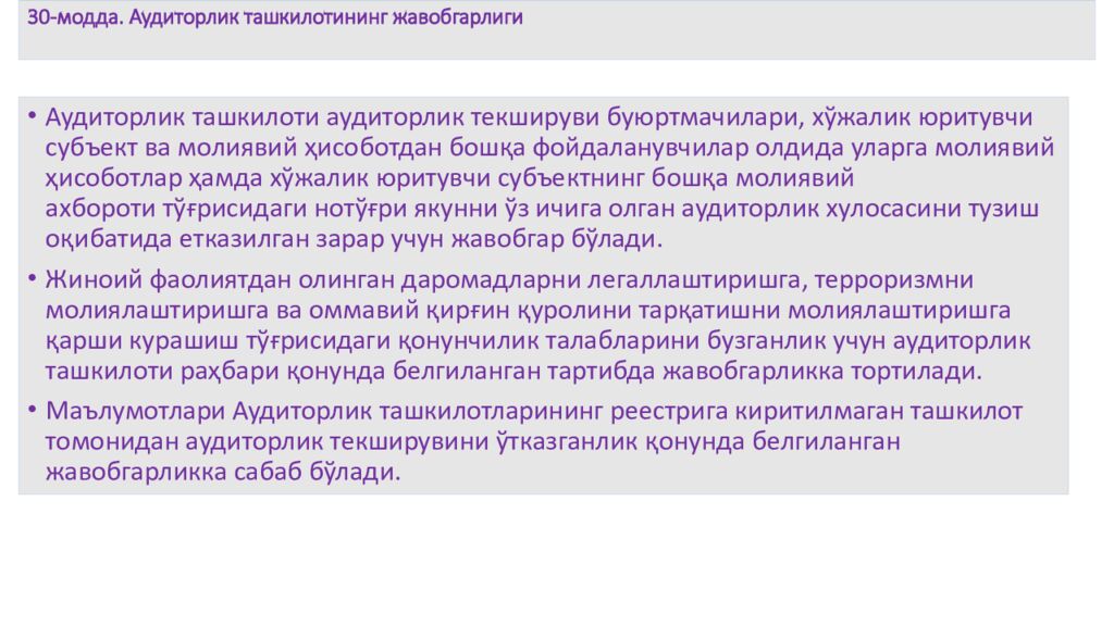 Слайд 16: 30-модда. Аудиторлик ташкилотининг жавобгарлиги