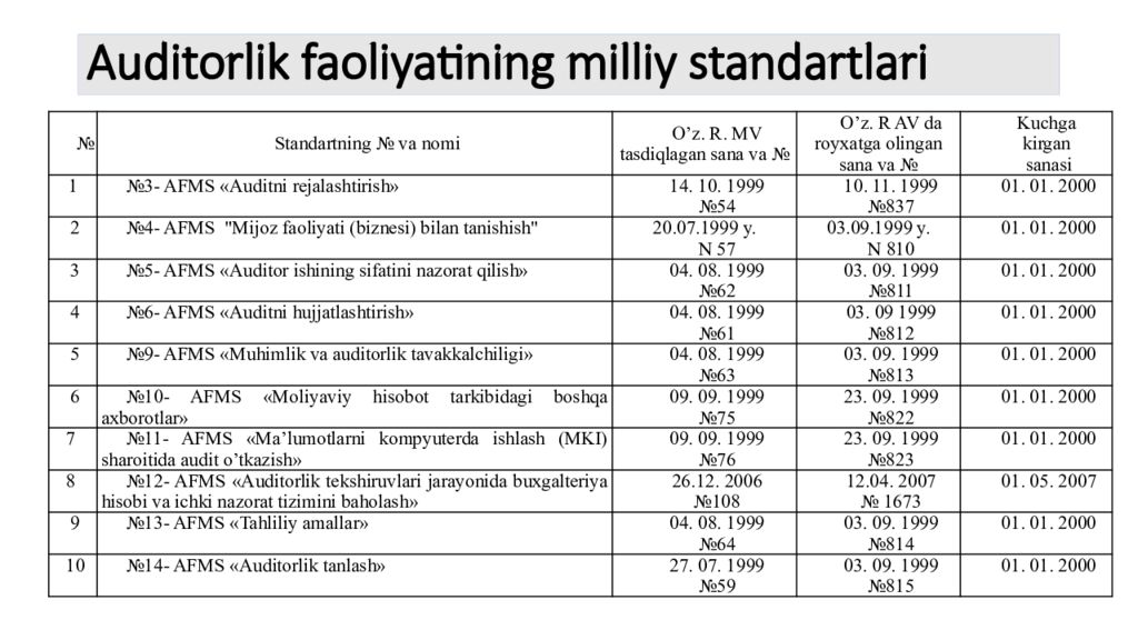 № Standartning № va nomi O’z. R. MV tasdiqlagan sana va № O’z. R AV da royxatga olingan sana va № Kuchga kirgan sanasi 1 №3- AFMS «Auditni rejalashtirish» 14. 10. 1999 №54 10. 11. 1999 №837 01. 01. 2000 2 №4- AFMS "Mijoz faoliyati (biznesi) bilan tanishish" 20.07.1999 y. N 57 03.09.1999 y. N 810 01. 01. 2000 3 №5- AFMS «Auditor ishining sifatini nazorat qilish » 04. 08. 1999 №62 03. 09. 1999 №811 01. 01. 2000 4 №6- AFMS «Auditni hujjatlashtirish» 04. 08. 1999 №61 03. 09 1999 №812 01. 01. 2000 5 №9- AFMS « Muhimlik va auditorlik tavakkalchiligi » 04. 08. 1999 №63 03. 09. 1999 №813 01. 01. 2000 6 №10- AFMS «Moliyaviy hisobot tarkibidagi boshqa axborotlar» 09. 09. 1999 №75 23. 09. 1999 №822 01. 01. 2000 7 №11- AFMS «Ma’lumotlarni kompyuterda ishlash (MKI) sharoitida audit o’tkazish» 09. 09. 1999 №76 23. 09. 1999 №823 01. 01. 2000 8 №12- AFMS « Auditorlik tekshiruvlari jarayonida buxgalteriya hisobi va ichki nazorat tizimini baholash » 26. 12. 2006 № 108 12.0 4. 2007 № 1673 01. 0 5. 200 7 9 №13- AFMS «Tahliliy amallar» 04. 08. 1999 №64 03. 09. 1999 №814 01. 01. 2000 10 №14- AFMS « Auditorlik tanlash » 27. 07. 1999 №59 03. 09. 1999 №815 01. 01. 2000