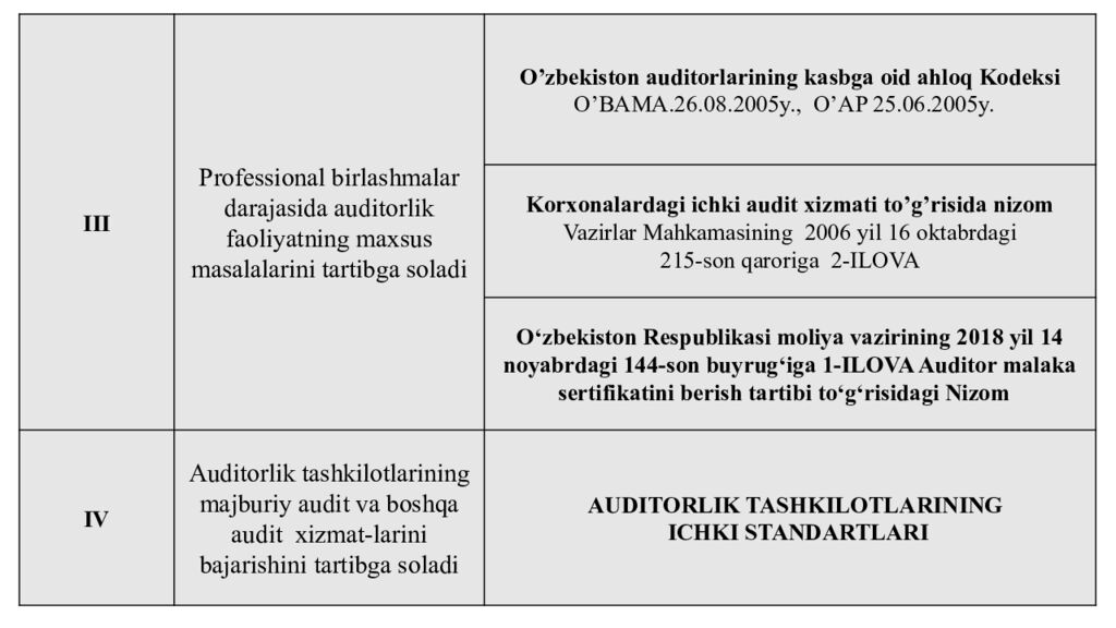 III P rofessional birlashmalar darajasida auditorlik faoliyatning maxsus masalalarini tartibga soladi O’zbekiston auditorlarining kasbga oid ahloq Kodeksi O’BAMA.26.08.2005y., O’AP 25.06.2005y. Korxonalardagi ichki audit xizmati to’g’risida nizom Vazirlar Mahkamasining 2006 yil 16 oktabrdagi 215-son qaroriga 2-ILOVA O‘zbekiston Respublikasi moliya vazirining 2018 yil 14 noyabrdagi 144-son buyrug‘iga 1-ILOVA Auditor malaka sertifikatini berish tartibi to‘g‘risidagi Nizom IV A uditorlik tashkilotlarining majburiy audit va boshqa audit xizmat - larini bajarishini tartibga soladi AU DITORLIK TASHKILOTLARINING ICHKI STANDARTLARI