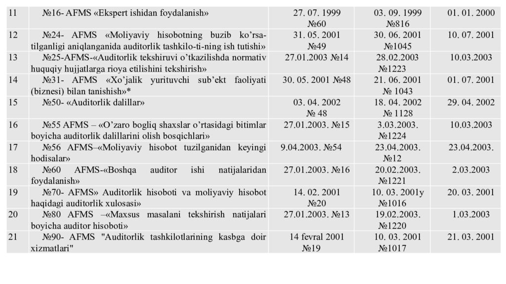 11 №16- AFMS «Ekspert ishidan foydalanish» 27. 07. 1999 №60 03. 09. 1999 №816 01. 01. 2000 12 №24- AFMS «Moliyaviy hisobotning buzib ko’rsa-tilganligi aniqlanganida auditorlik tashkilo-ti-ning ish tutishi» 31. 05. 2001 №49 30. 06. 2001 №1045 10. 07. 2001 13 №25-AFMS-«Auditorlik tekshiruvi o’tkazilishda normativ huquqiy hujjatlarga rioya etilishini tekshirish» 27.01.2003 №14 28.02.2003 №1223 10.03.2003 14 №31- AFMS «Xo’jalik yurituvchi sub’ekt faoliyati (biznesi) bilan tanishish»* 30. 05. 2001 №48 21. 06. 2001 № 1043 01. 07. 2001 15 №50- «Auditorlik dalillar» 03. 04. 2002 № 48 18. 04. 2002 № 1128 29. 04. 2002 16 №55 AFMS – «O’zaro bogliq shaxslar o’rtasidagi bitimlar boyicha auditorlik dalillarini olish bosqichlari» 27.01.2003. №15 3.03.2003. №1224 10.03.2003 17 №56 AFMS–«Moliyaviy hisobot tuzilganidan keyingi hodisalar» 9.04.2003. №54 23.04.2003. №12 23.04.2003. 18 №60 AFMS-«Boshqa auditor ishi natijalaridan foydalanish» 27.01.2003. №16 20.02.2003. №1221 2.03.2003 19 №70- AFMS» Auditorlik hisoboti va moliyaviy hisobot haqidagi auditorlik xulosasi » 14. 02. 2001 №20 10. 03. 2001y №1016 20. 03. 2001 20 №80 AFMS –«Maxsus masalani tekshirish natijalari boyicha auditor hisoboti» 27.01.2003. №13 19.02.2003. №1220 1.03.2003 21 №90- AFMS "Auditorlik tashkilotlarining kasbga doir xizmatlari" 14 fevral 2001 №19 10. 03. 2001 №1017 21. 03. 2001