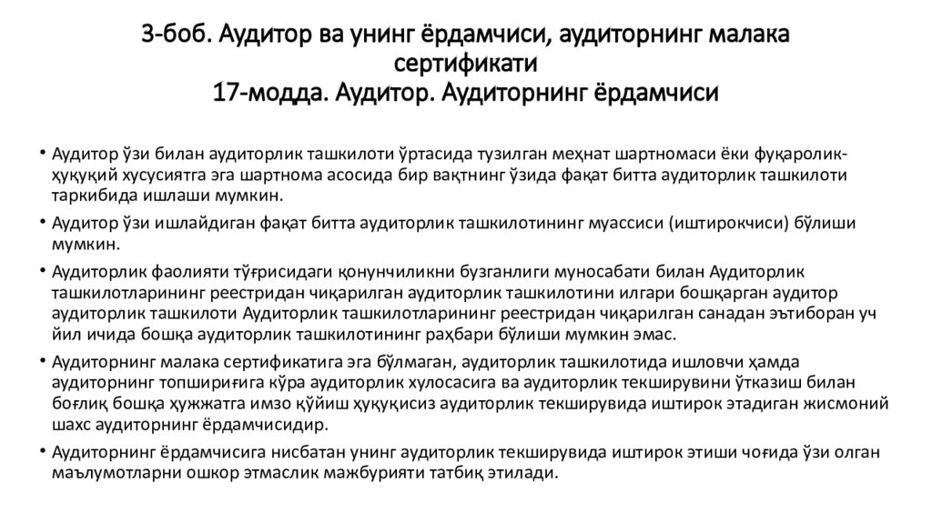 Слайд 8: 3-боб. Аудитор ва унинг ёрдамчиси, аудиторнинг малака сертификати 17-модда. Аудитор. Аудиторнинг ёрдамчиси
