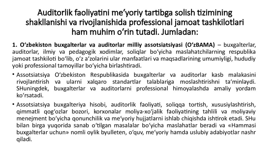 1. O‘zbekiston buxgalterlar va auditorlar milliy assotsiatsiyasi (O‘zBAMA) – buxgalterlar, auditorlar, ilmiy va pedagogik xodimlar, soliqlar bo‘yicha maslahatchilarning respublika jamoat tashkiloti bo‘lib, o‘z a‘zolarini ular manfaatlari va maqsadlarining umumiyligi, hududiy yoki professional tamoyillar bo‘yicha birlashtiradi. Assotsiatsiya O‘zbekiston Respublikasida buxgalterlar va auditorlar kasb malakasini rivojlantirish va ularni xalqaro standartlar talablariga moslashtirishni ta‘minlaydi. SHuningdek, buxgalterlar va auditorlarni professional himoyalashda amaliy yordam ko‘rsatadi. Assotsiatsiya buxgalteriya hisobi, auditorlik faoliyati, soliqqa tortish, xususiylashtirish, qimmatli qog‘ozlar bozori, korxonalar moliya-xo‘jalik faoliyatining tahlili va moliyaviy menejment bo‘yicha qonunchilik va me‘yoriy hujjatlarni ishlab chiqishda ishtirok etadi. SHu bilan birga yuqorida sanab o‘tilgan masalalar bo‘yicha maslahatlar beradi va «Hammasi buxgalterlar uchun» nomli oylik byulleten, o‘quv, me‘yoriy hamda uslubiy adabiyotlar nashr qiladi.