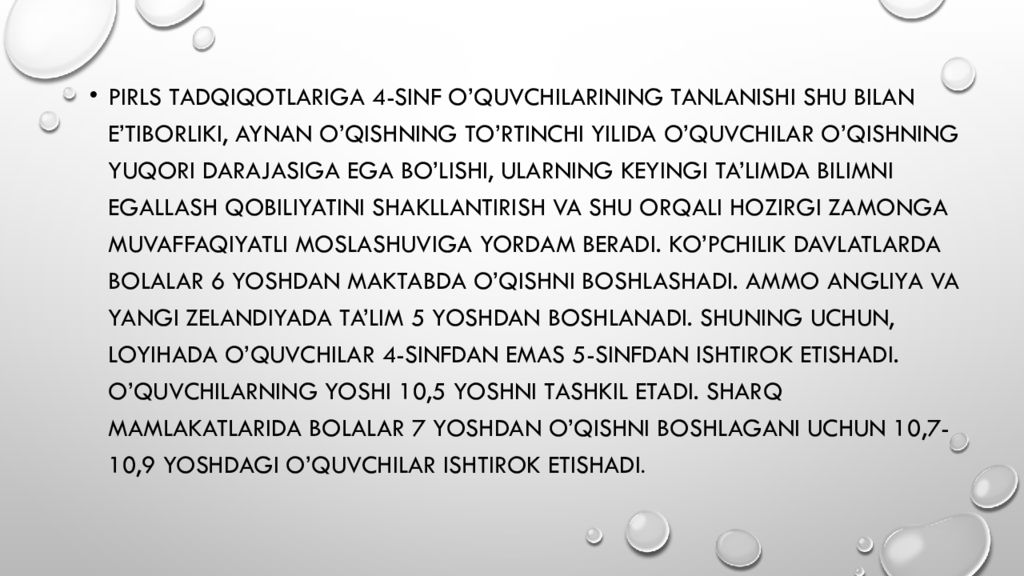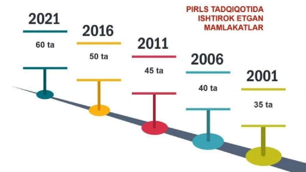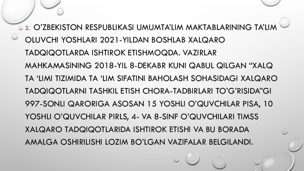 2. O’zbekiston Respublikasi umumta’lim maktablarining ta’lim oluvchi yoshlari 2021-yildan boshlab Xalqaro tadqiqotlarda ishtirok etishmoqda. Vazirlar Mahkamasining 2018-yil 8-dekabr kuni qabul qilgan “Xalq ta ‘ limi tizimida ta ‘lim sifatini baholash sohasidagi xalqaro tadqiqotlarni tashkil etish chora-tadbirlari to’g’risida”gi 997-sonli qaroriga asosan 15 yoshli o’quvchilar PISA, 10 yoshli o’quvchilar PIRLS, 4- va 8-sinf o’quvchilari TIMSS xalqaro tadqiqotlarida ishtirok etishi va bu borada amalga oshirilishi lozim bo’lgan vazifalar belgilandi.