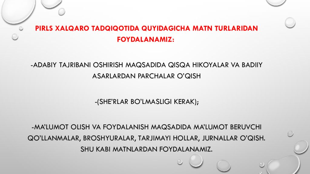 PIRLS xalqaro tadqiqotida quyidagicha matn turlaridan foydalanamiz: -Adabiy tajribani oshirish maqsadida qisqa hikoyalar va badiiy asarlardan parchalar o’qish -(she’rlar bo’lmasligi kerak); -Ma’lumot olish va foydalanish maqsadida ma’lumot beruvchi qo’llanmalar, broshyuralar, tarjimayi hollar, jurnallar o’qish. Shu kabi matnlardan foydalanamiz.