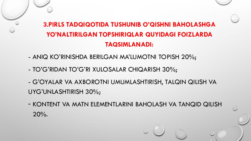 3.PIRLS tadqiqotida tushunib o’qishni baholashga yo’naltirilgan topshiriqlar quyidagi foizlarda taqsimlanadi: - Aniq ko’rinishda berilgan ma’lumotni topish 20%; - To’g’ridan to’g’ri xulosalar chiqarish 30%; - G’oyalar va axborotni umumlashtirish, talqin qilish va uyg’unlashtirish 30%; Kontent va matn elementlarini baholash va tanqid qilish 20%.