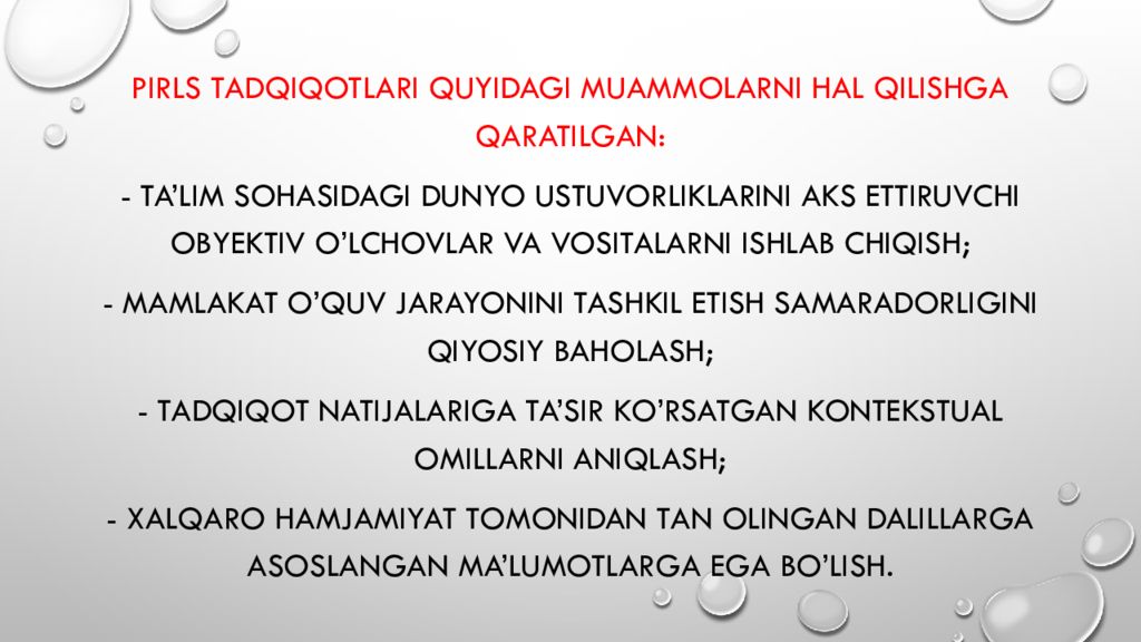 PIRLS tadqiqotlari quyidagi muammolarni hal qilishga qaratilgan: - ta’lim sohasidagi dunyo ustuvorliklarini aks ettiruvchi obyektiv o’lchovlar va vositalarni ishlab chiqish; - mamlakat o’quv jarayonini tashkil etish samaradorligini qiyosiy baholash; - tadqiqot natijalariga ta’sir ko’rsatgan kontekstual omillarni aniqlash; - xalqaro hamjamiyat tomonidan tan olingan dalillarga asoslangan ma’lumotlarga ega bo’lish.