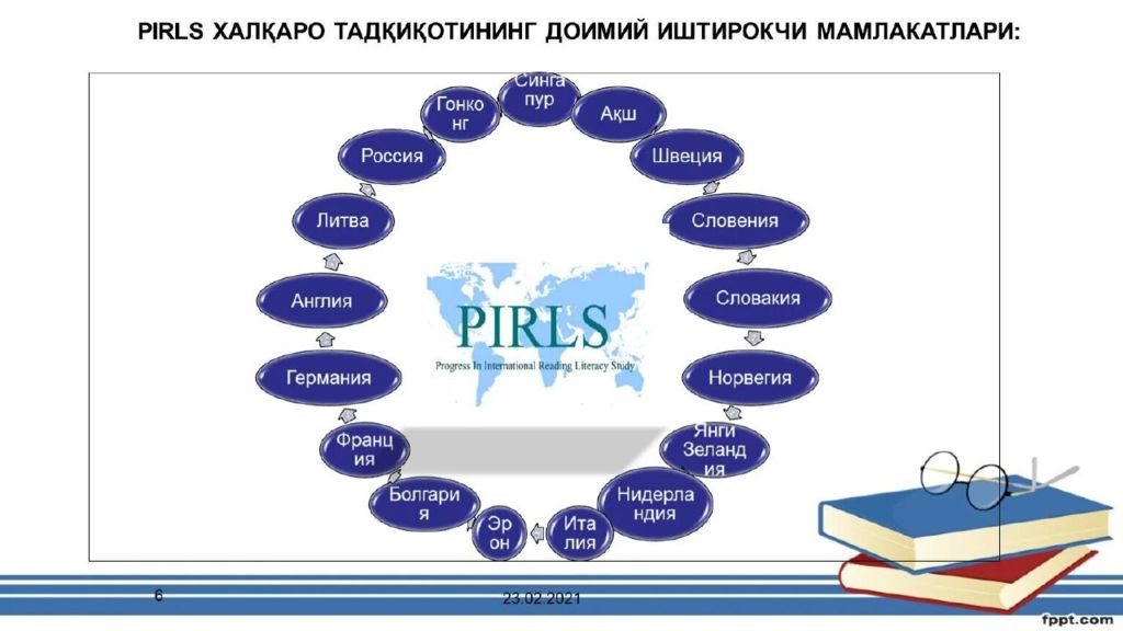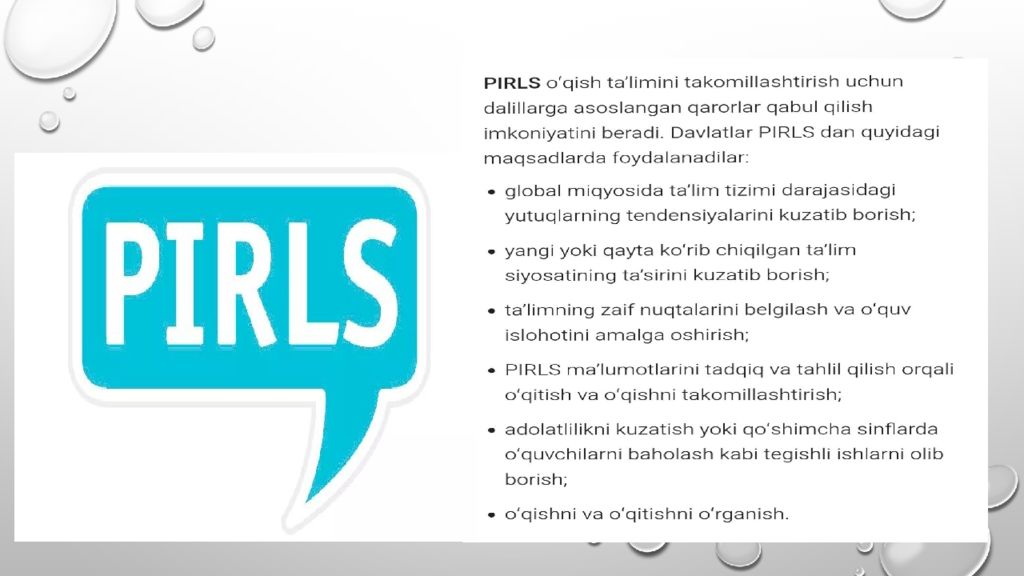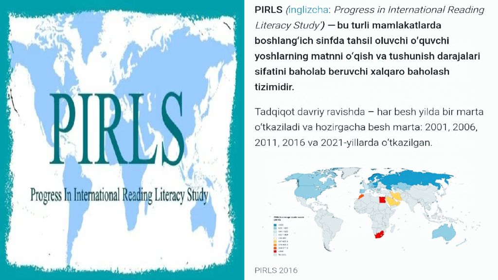 Reja: PIRLS tadqiqotida matn turlari. 2.PIRLS baholash dasturida topshiriqlar. 3. PIRLS tadqiqotida Baholash tartibi.