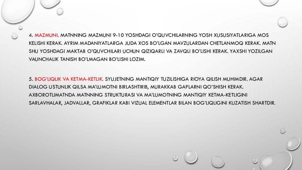 4. Mazmuni. Matnning mazmuni 9-10 yoshdagi o’quvchilarning yosh xususiyatlariga mos kelishi kerak. Ayrim madaniyatlarga juda xos bo’lgan mavzulardan chetlanmoq kerak. Matn shu yoshdagi maktab o’quvchilari uchun qiziqarli va zavqli bo’lishi kerak. Yaxshi yozilgan vaunchalik tanish bo’lmagan bo’lishi lozim. 5. Bog’liqlik va ketma- ketlik. Syujetning mantiqiy tuzilishiga rioya qilish muhimdir. Agar dialog ustunlik qilsa ma’lumotni birlashtirib, murakkab gaplarni qo’shish kerak. Axborotlimatnda matnning strukturasi va ma’lumotning mantiqiy ketma- ketligini sarlavhalar, jadvallar, grafiklar kabi vizual elementlar bilan bog’liqligini kuzatish shartdir.