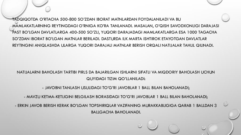 Tadqiqotda o’rtacha 500-800 so’zdan iborat matnlardan foydalaniladi va bu mamlakatlarning reytingdagi o’rniga ko’ra tanlanadi. Masalan, o’qish savodxonligi darajasi past bo’lgan davlatlarga 400-500 so’zli, yuqori darajadagi mamlakatlarga esa 1000 tagacha so’zdan iborat bo’lgan matnlar beriladi. Dasturda ilk marta ishtirok etayotgan davlatlar reytingini aniqlashda ularga yuqori darajali matnlar berish orqali natijalar tahlil qilinadi. Natijalarni baholash tartibi PIRLS da bajarilgan ishlarni sifatli va miqdoriy baholash uchun quyidagi tizim qo’llaniladi: - javobni tanlash usulidagi to’g’ri javoblar 1 ball bilan baholanadi; - mavzu ketma- ketligini belgilash borasidagi to’g’ri javoblar 1 ball bilan baholanadi; - erkin javob berish kerak bo’lgan topshiriqlar vazifaning murakkabligiga qarab 1 balldan 3 ballgacha baholanadi.