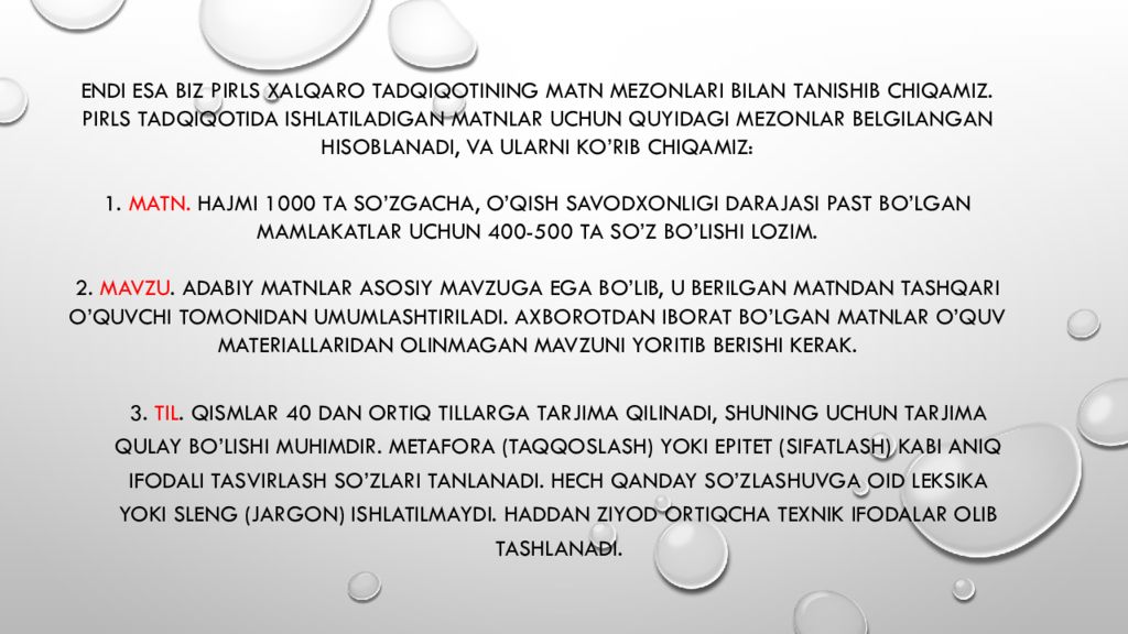 Endi esa biz PIRLS xalqaro tadqiqotining matn mezonlari bilan tanishib chiqamiz. PIRLS tadqiqotida ishlatiladigan matnlar uchun quyidagi mezonlar belgilangan hisoblanadi, va ularni ko’rib chiqamiz: 1. Matn. Hajmi 1000 ta so’zgacha, o’qish savodxonligi darajasi past bo’lgan mamlakatlar uchun 400-500 ta so’z bo’lishi lozim. 2. Mavzu. Adabiy matnlar asosiy mavzuga ega bo’lib, u berilgan matndan tashqari o’quvchi tomonidan umumlashtiriladi. Axborotdan iborat bo’lgan matnlar o’quv materiallaridan olinmagan mavzuni yoritib berishi kerak. 3. Til. Qismlar 40 dan ortiq tillarga tarjima qilinadi, shuning uchun tarjima qulay bo’lishi muhimdir. Metafora (taqqoslash) yoki epitet (sifatlash) kabi aniq ifodali tasvirlash so’zlari tanlanadi. Hech qanday so’zlashuvga oid leksika yoki sleng (jargon) ishlatilmaydi. Haddan ziyod ortiqcha texnik ifodalar olib tashlanadi.