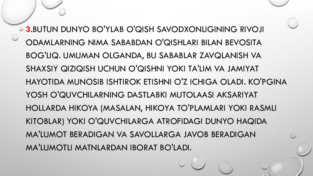 3.Butun dunyo bo'ylab o'qish savodxonligining rivoji odamlarning nima sababdan o'qishlari bilan bevosita bog'liq. Umuman olganda, bu sabablar zavqlanish va shaxsiy qiziqish uchun o'qishni yoki ta'lim va jamiyat hayotida munosib ishtirok etishni o'z ichiga oladi. Ko'pgina yosh o'quvchilarning dastlabki mutolaasi aksariyat hollarda hikoya (masalan, hikoya to'plamlari yoki rasmli kitoblar) yoki o'quvchilarga atrofidagi dunyo haqida ma'lumot beradigan va savollarga javob beradigan ma'lumotli matnlardan iborat bo'ladi.