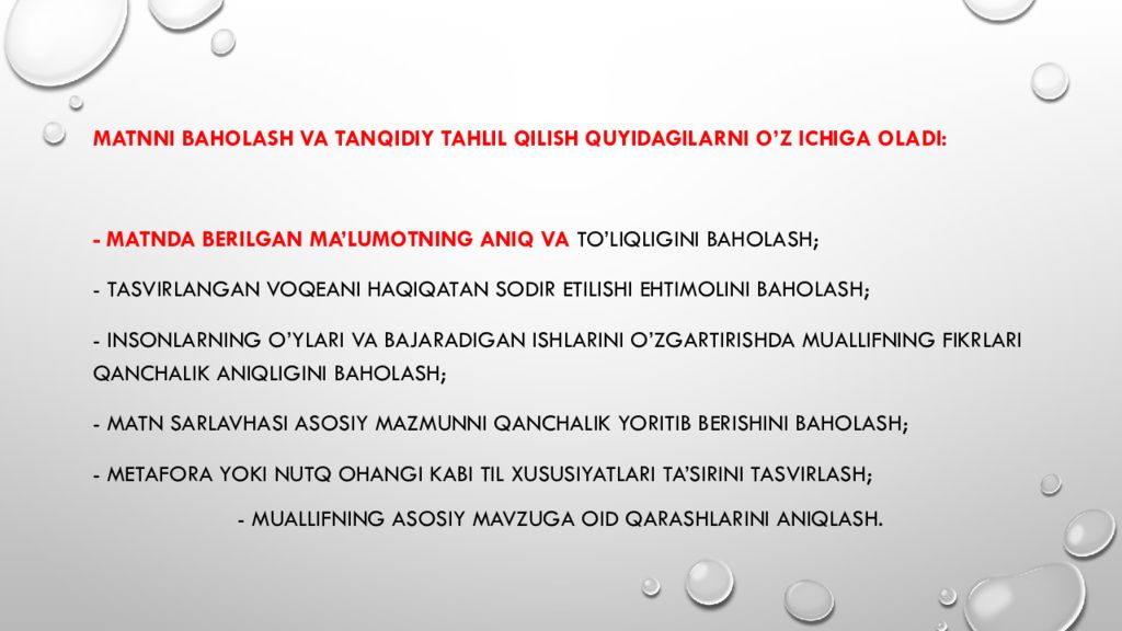 Matnni baholash va tanqidiy tahlil qilish quyidagilarni o’z ichiga oladi: - Matnda berilgan ma’lumotning aniq va to’liqligini baholash; - Tasvirlangan voqeani haqiqatan sodir etilishi ehtimolini baholash; - Insonlarning o’ylari va bajaradigan ishlarini o’zgartirishda muallifning fikrlari qanchalik aniqligini baholash; - Matn sarlavhasi asosiy mazmunni qanchalik yoritib berishini baholash; - Metafora yoki nutq ohangi kabi til xususiyatlari ta’sirini tasvirlash; - Muallifning asosiy mavzuga oid qarashlarini aniqlash.