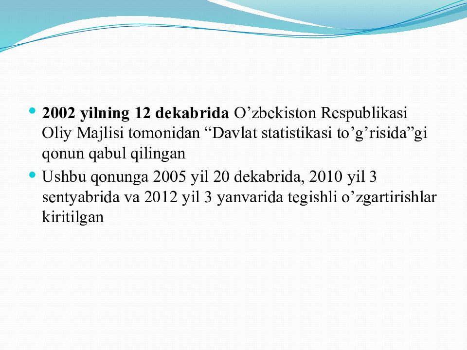 2002 yilning 12 dekabrida O’zbekiston Respublikasi Oliy Majlisi tomonidan “Davlat statistikasi to’g’risida”gi qonun qabul qilingan Ushbu qonunga 2005 yil 20 dekabrida, 2010 yil 3 sentyabrida va 2012 yil 3 yanvarida tegishli o’zgartirishlar kiritilgan