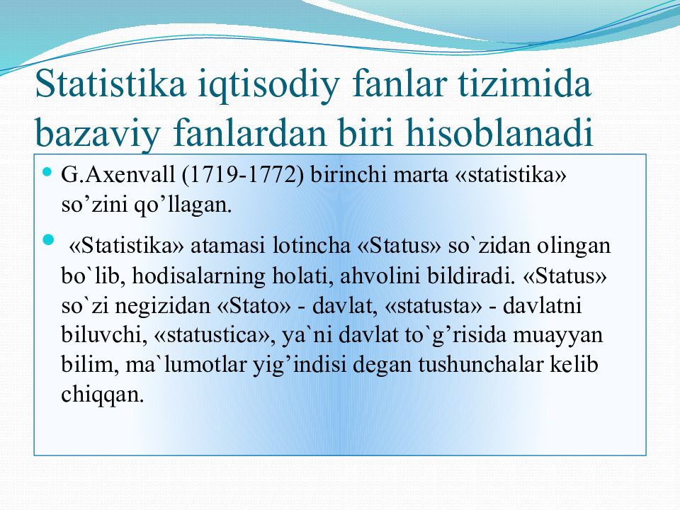 G.Axenvall (1719-1772) birinchi marta «statistika» so’zini qo’llagan. « Statistika » atamasi lotincha «Status» so`zidan olingan bo`lib, hodisalarning holati, ahvolini bildiradi. «Status» so`zi negizidan « Stato » - davlat, « statusta » - davlatni biluvchi, « statustica », ya`ni davlat to`g’risida muayyan bilim, ma`lumotlar yig’indisi degan tushunchalar kelib chiqqan.
