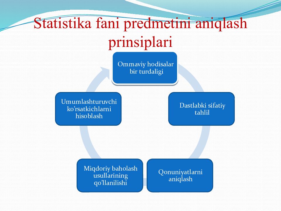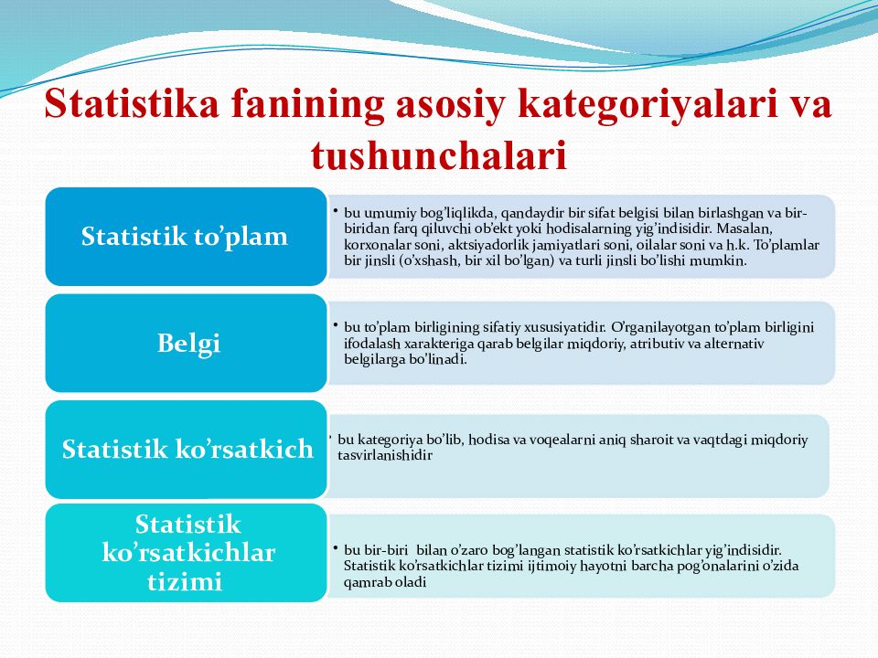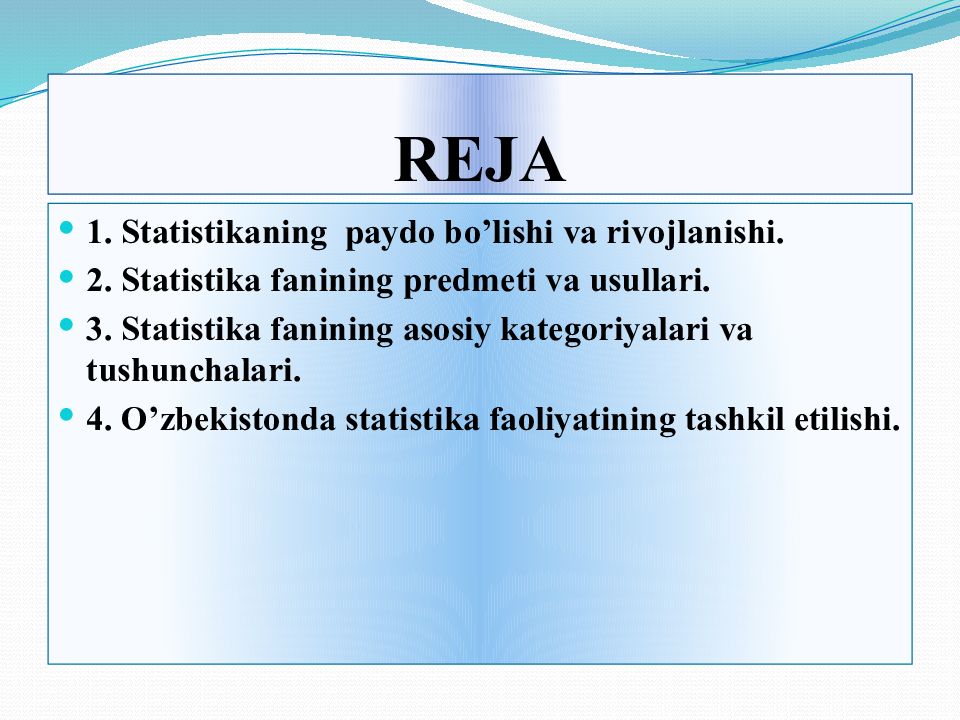 1. Statistikaning paydo b o’ lishi va rivojlanishi. 2. Statistika fanining predmeti va usullari. 3. Statistika fanining asosiy kategoriyalari va tushunchalari. 4. O’zbekistonda statistika faoliyatining tashkil etilishi.
