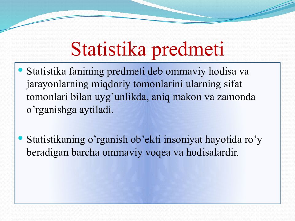 Statistika fanining predmeti deb ommaviy hodisa va jarayonlarning miqdoriy tomonlarini ularning sifat tomonlari bilan uyg’unlikda, aniq makon va zamonda o’rganishga aytiladi. Statistikaning o’rganish ob’ekti insoniyat hayotida ro’y beradigan barcha ommaviy voqea va hodisalardir.