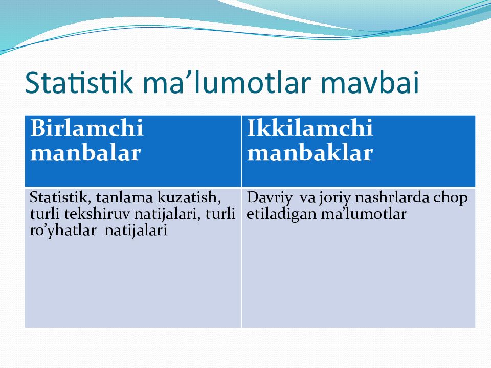 Birlamchi manbalar Ikkilamchi manbaklar Statistik, tanlama kuzatish, turli tekshiruv natijalari, turli ro’yhatlar natijalari Davriy va joriy nashrlarda chop etiladigan ma’lumotlar