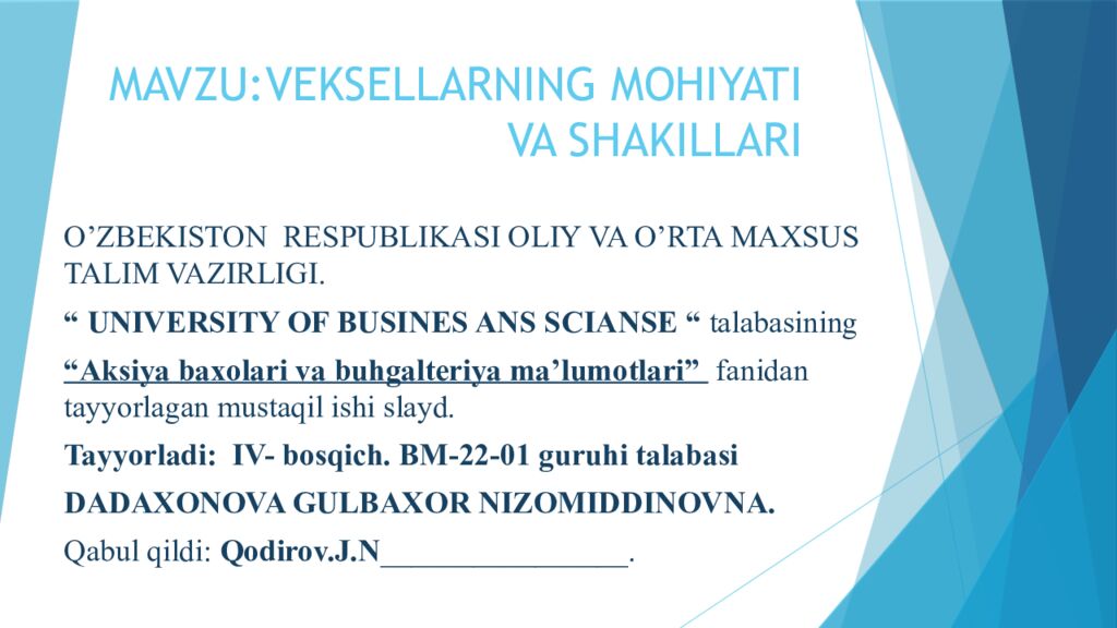 O’ZBEKISTON RESPUBLIKASI OLIY VA O’RTA MAXSUS TALIM VAZIRLIGI. “ UNIVERSITY OF BUSINES ANS SCIANSE “ talabasining “ Aksiya baxolari va buhgalteriya ma’lumotlari ” fanidan tayyorlagan mustaqil ishi slayd. Tayyorladi : IV- bosqich. BM-22-01 guruhi talabasi DADAXONOVA GULBAXOR NIZOMIDDINOVNA. Qabul qildi : Qodirov.J.N ________________.