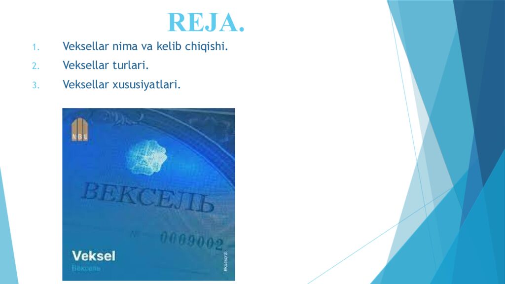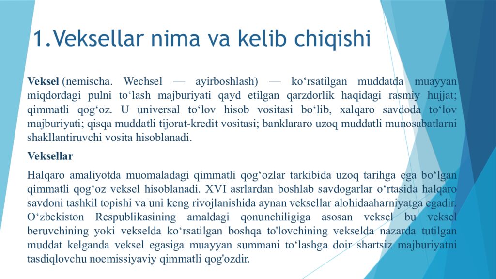Слайд 3: 1.Veksellar nima va kelib chiqishi