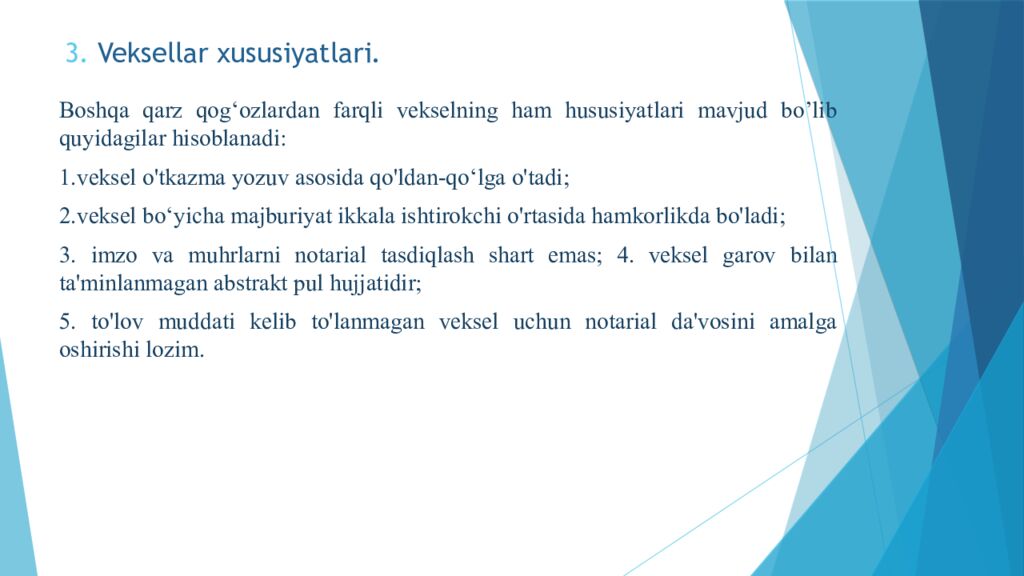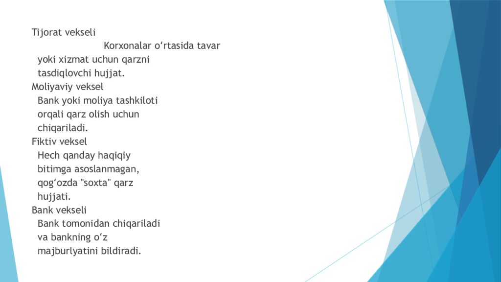 Veksellar nima va kelib chiqishi. Veksellar turlari. Veksellar xususiyatlari.