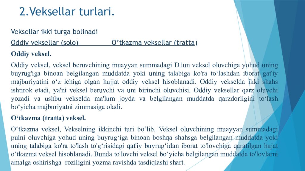 Veksellar ikki turga bolinadi Oddiy veksellar (solo) O’tkazma veksellar ( tratta ) Oddiy veksel. Oddiy veksel, veksel beruvchining muayyan summadagi D1un veksel oluvchiga yohud uning buyrug'iga binoan belgilangan muddatda yoki uning talabiga ko'ra toʻlashdan iborat gat'iy majburiyatini oʻz ichiga olgan hujjat oddiy veksel hisoblanadi. Oddiy vekselda ikki shahs ishtirok etadi, ya'ni veksel beruvchi va uni birinchi oluvchisi. Oddiy veksellar qarz oluvchi yozadi va ushbu vekselda ma'lum joyda va belgilangan muddatda qarzdorligini toʻlash boʻyicha majburiyatni zimmasiga oladi. Oʻtkazma ( tratta ) veksel. Oʻtkazma veksel, Vekselning ikkinchi turi boʻlib. Veksel oluvchining muayyan summadagi pulni oluvchiga yohud uning buyrugʻiga binoan boshqa shahsga belgilangan muddatda yoki uning talabiga ko'ra to'lash to'gʻrisidagi qat'iy buyrugʻidan iborat to'lovchiga qaratilgan hujat oʻtkazma veksel hisoblanadi. Bunda to'lovchi veksel boʻyicha belgilangan muddatda to'lovlarni amalga oshirishga roziligini yozma ravishda tasdiqlashi shart.