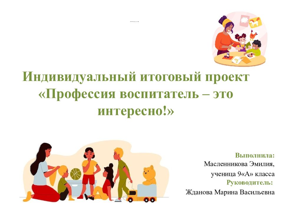 Выполнила: Масленникова Эмилия, ученица 9«А» класса Руководитель: Жданова Марина Васильевна И ндивидуальный итоговый проект «Профессия воспитатель – это интересно!»