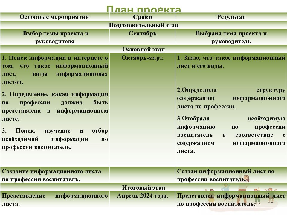 Основные мероприятия Сроки Результат Подготовительный этап Выбор темы проекта и руководителя Сентябрь Выбрана тема проекта и руководитель Основной этап 1. Поиск информации в интернете о том, что такое информационный лист, виды информационных листов. 2. Определение, какая информация по профессии должна быть представлена в информационном листе. 3. Поиск, изучение и отбор необходимой информации по профессии воспитатель. Октябрь-март. 1. Знаю, что такое информационный лист и его виды. 2.Определила структуру (содержание) информационного листа по профессии. 3.Отобрала необходимую информацию по профессии воспитатель в соответствие с содержанием информационного листа. Создание информационного листа по профессии воспитатель. Создан информационный лист по профессии воспитатель. Итоговый этап Представление информационного листа. Апрель 2024 года. Представлен информационный лист по профессии воспитатель.